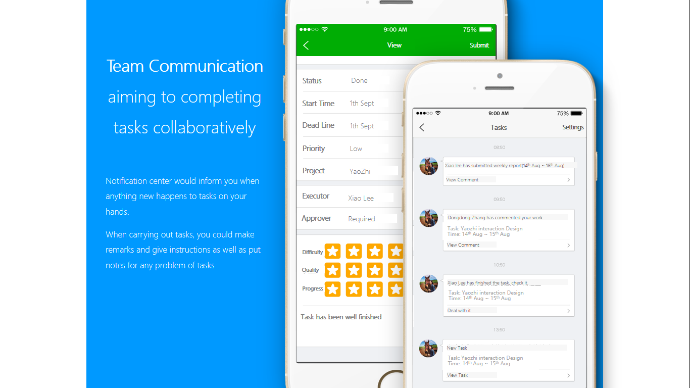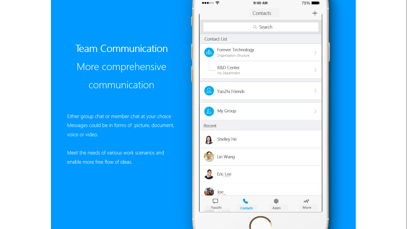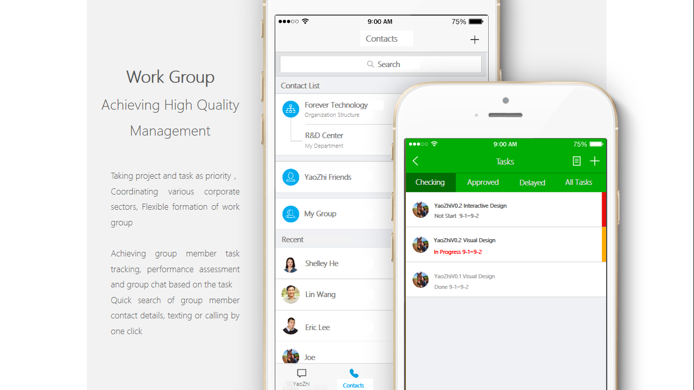 "YAO ZHI" is a corporate communication and co-working application, provides major functions such as real-time communication, picture sharing, task collaboration, establishs working group for particular task and turns it into joint task by group discussion conclusion, and provides project management based on monitoring of daily tasks, improving overall work efficiency.